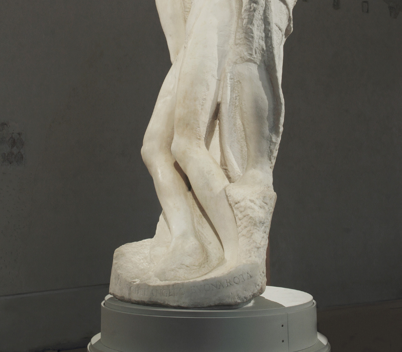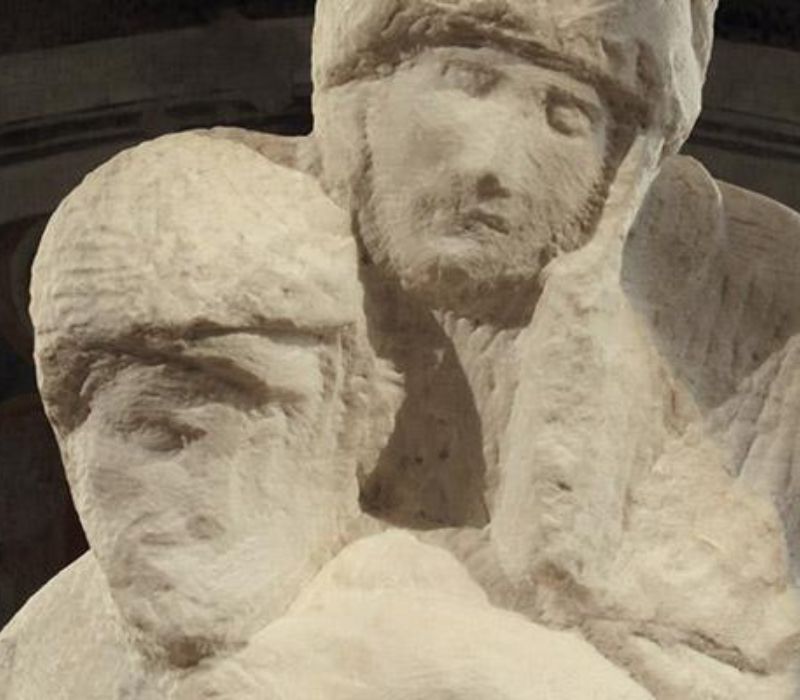 La Pietà Rondanini è testamento e meditazione del vecchio artista sulla morte e la salvezza dell’anima. In quest’opera lo scultore rinuncia alla perfezione del corpo e alla sua eroica bellezza, trasformando il Cristo morto in emblema di sofferenza. La posizione dei corpi di Maria e Gesù ad altezze diverse sembra suggerire l’intrecciarsi di più momenti della vicenda di Cristo: deposizione dalla Croce, seppellimento, addirittura Resurrezione, nel dissolvimento del corpo del Figlio nell’abbraccio materno