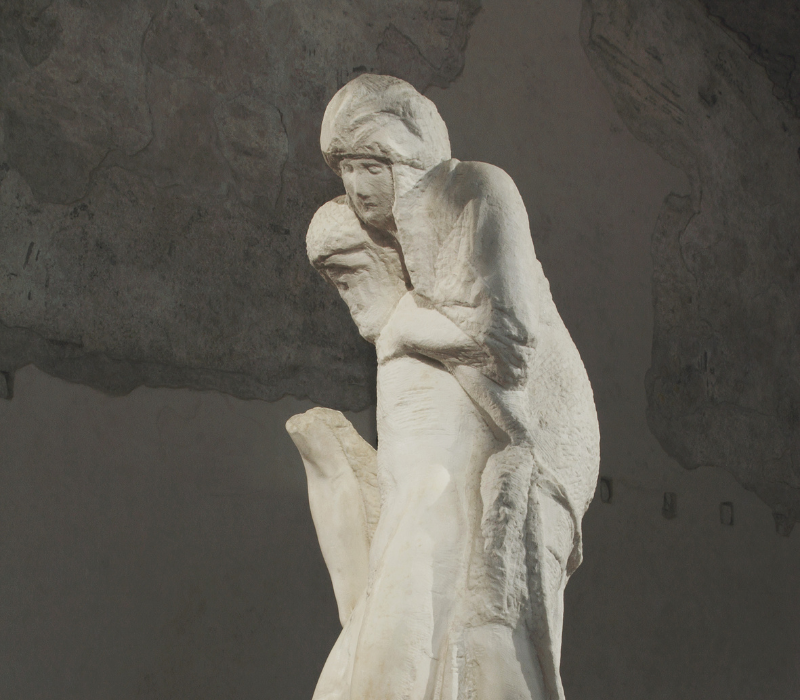 Lo scultore lavorò alla Pietà negli ultimi dieci anni della sua vita, modificandone progressivamente l’impostazione. La scultura, visibile da ogni lato nel nuovo allestimento, si inserisce armoniosamente nel luogo destinato nel ‘500 ai soldati del Castello sofferenti o malati di peste.