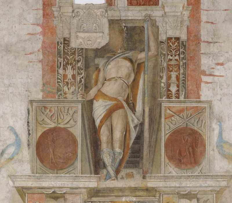 Della figura centrale è andata perduta la testa, per modifiche architettoniche alla sala già in età sforzesca. Vestito di un mantello di pelle animale, con un bastone in una mano e un caduceo nell’altra, Argo doveva avere il capo coperto da un diadema o un turbante di piume di pavone, allusione ai suoi cento occhi. Due medaglioni ai lati narrano come Mercurio abbia addormentato Argo con la musica e come lo abbia ucciso. Più complessa resta l'interpretazione della scena sul medaglione centrale. Appare qui un gruppo di persone con al centro seduto un personaggio che tiene il piede destro su un globo.