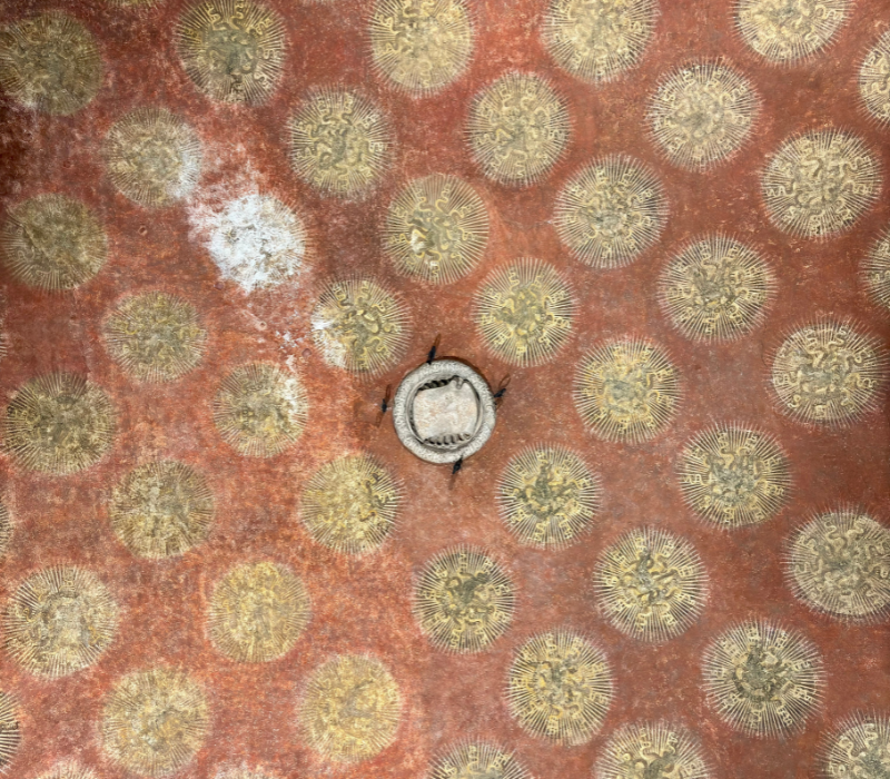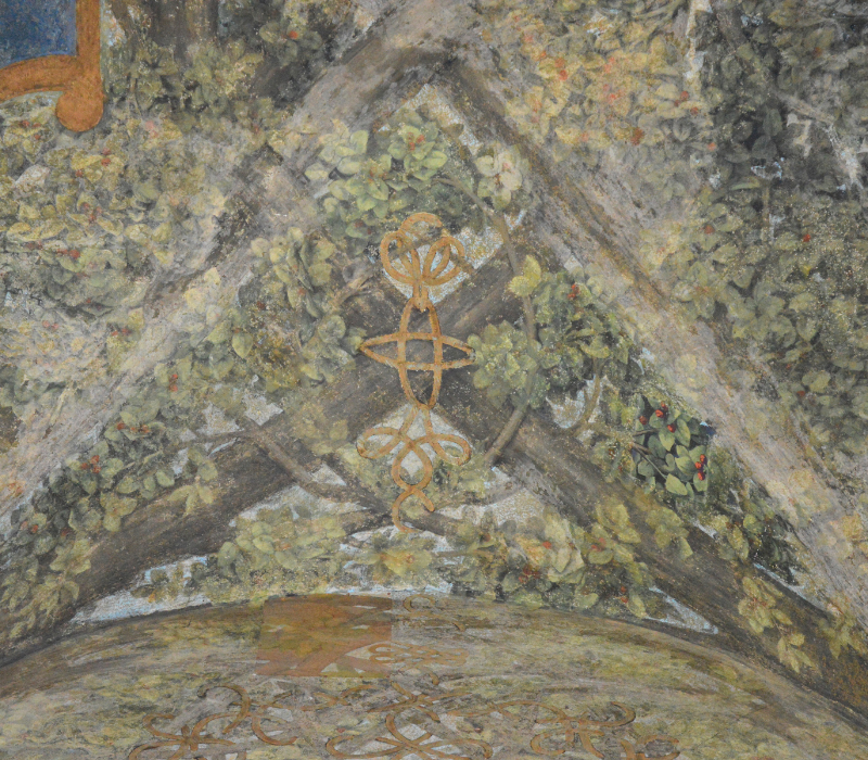 La sala ha la volta ornata da stemmi di Galeazzo Maria Sforza su fondo azzurro, con le iniziali dipinte “GZ MA” e il titolo “DVX MLI” (Galeazzo Maria Duca di Milano). Appassionatissimo di araldica, il Signore di Milano fece riprodurre le sue iniziali in molti ambienti della residenza.