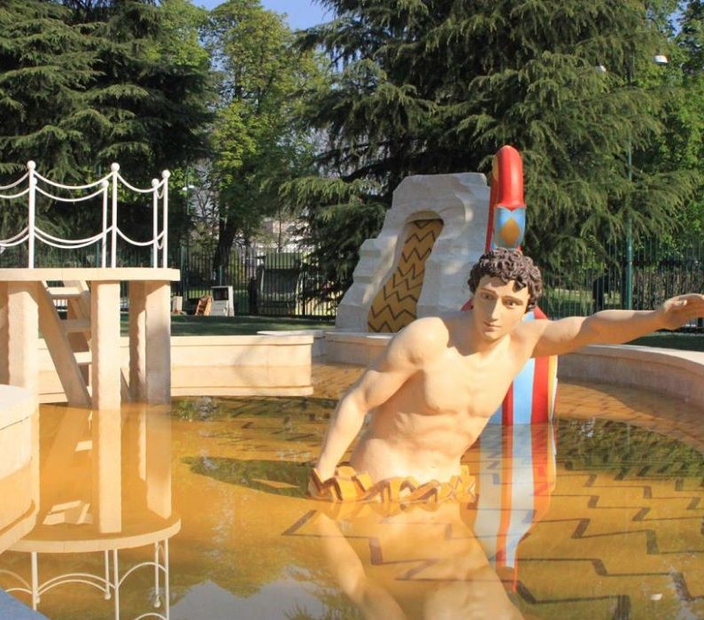 Collocata nel parco nel 1973 nell’ambito del progetto “Contatto Arte-Città” realizzato per la XV Triennale di Milano, la fontana Bagni Misteriosi rappresenta la più grande opera scultorea di Giorgio De Chirico. In pietra di Vicenza, il complesso è formato da otto elementi ambientati in una grande vasca dalla forma sinuosa. Una parte del fondo della vasca, in giallo ocra, richiama le onde con un disegno a parquet. Proprio un lucidissimo parquet, in cui si specchiavano le gambe delle persone, ispirò a De Chirico il parallelismo tra pavimento e acqua e il progetto di questa fontana. L’opera raffigura un tema assai caro allo scultore, che nel corso della sua attività ha più volte rappresentato personaggi enigmatici immersi nell’acqua.