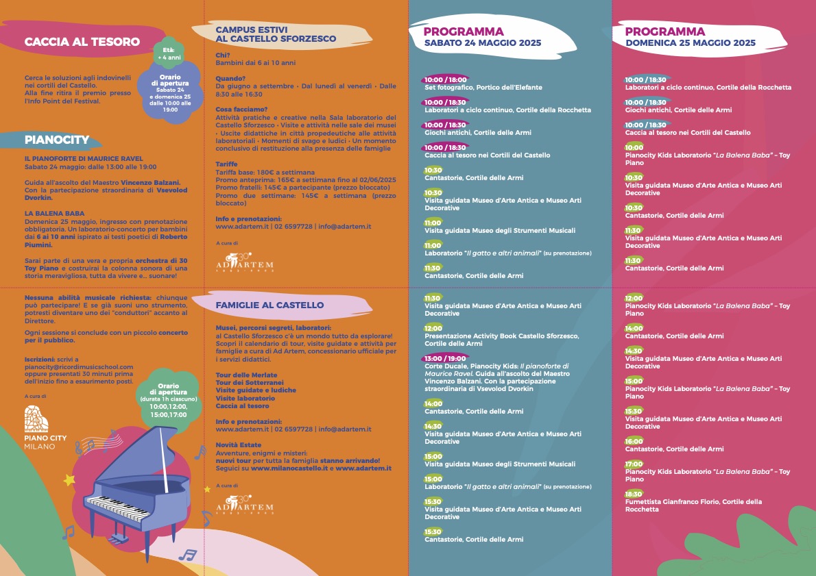 Durante il Festival, i cortili ospiteranno laboratori, giochi, cacce al tesoro, visite guidate a cura di Ad Artem, cantastorie e musica dal vivo, offrendo attività adatte e aperte a tutte e tutti. Entrambi i giorni vedranno anche la partecipazione di PianoCity Milano, in un ricco programma che intreccia cultura, musica e inclusione.