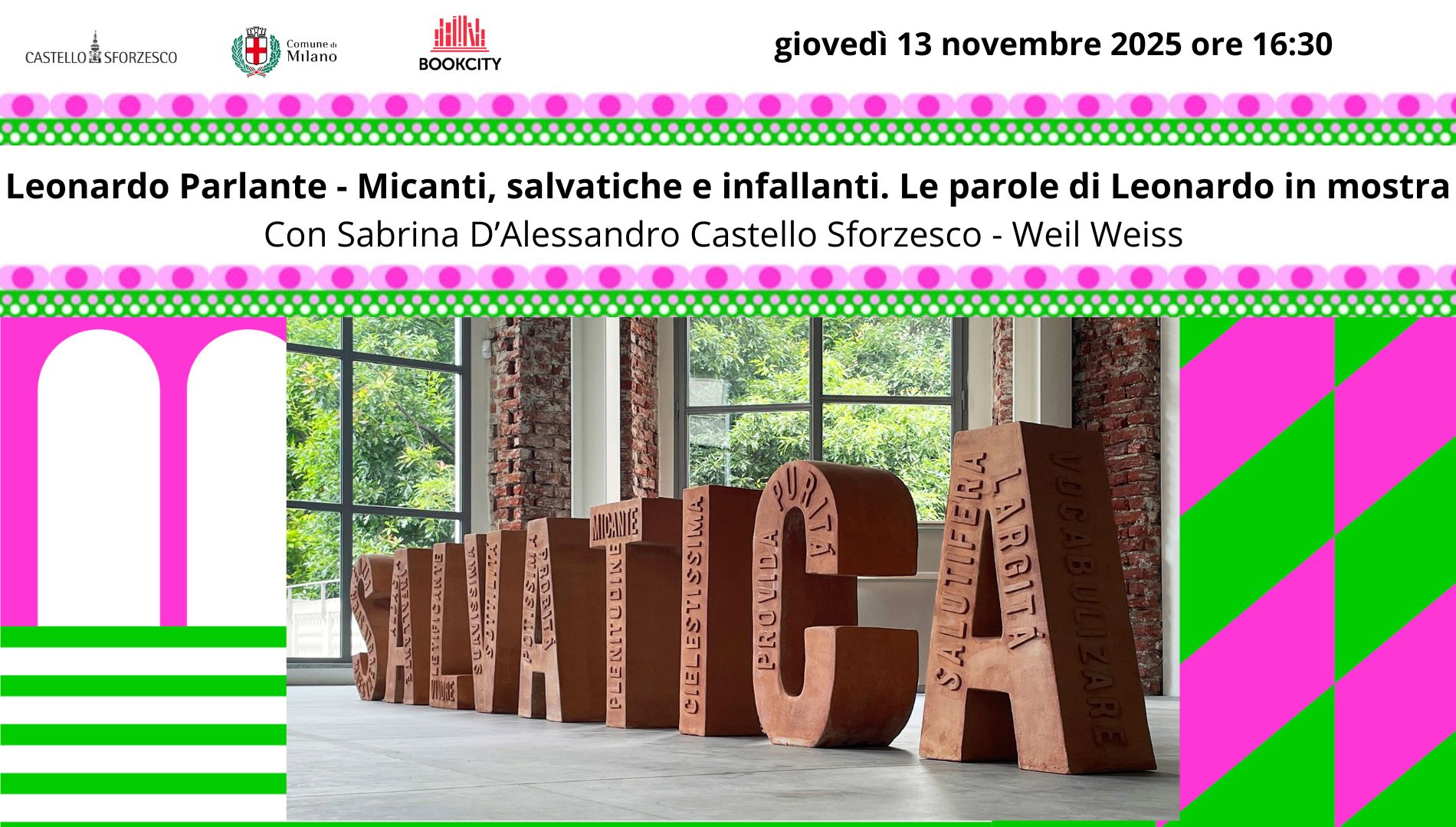 Con la mostra Leonardo Parlante, Sabrina D’Alessandro porta alla luce un lato poco conosciuto del genio rinascimentale: quello di ricercatore e collezionista di parole. Durante il suo soggiorno milanese, Leonardo da Vinci si dedicò infatti ad arricchire il proprio vocabolario, trascrivendo circa ottomila termini in forma di liste nel Codice Trivulziano 2162, un taccuino di appunti oggi custodito presso l’Archivio Storico Civico e Biblioteca Trivulziana del Castello Sforzesco di Milano.