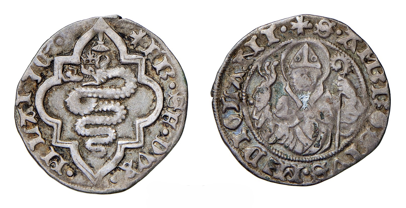 11. grosso da 3 soldi, argento; D/stemma con biscia sormontato da cimiero con mostro alato R/ morso con nastro