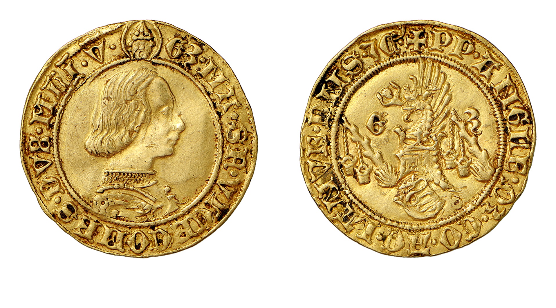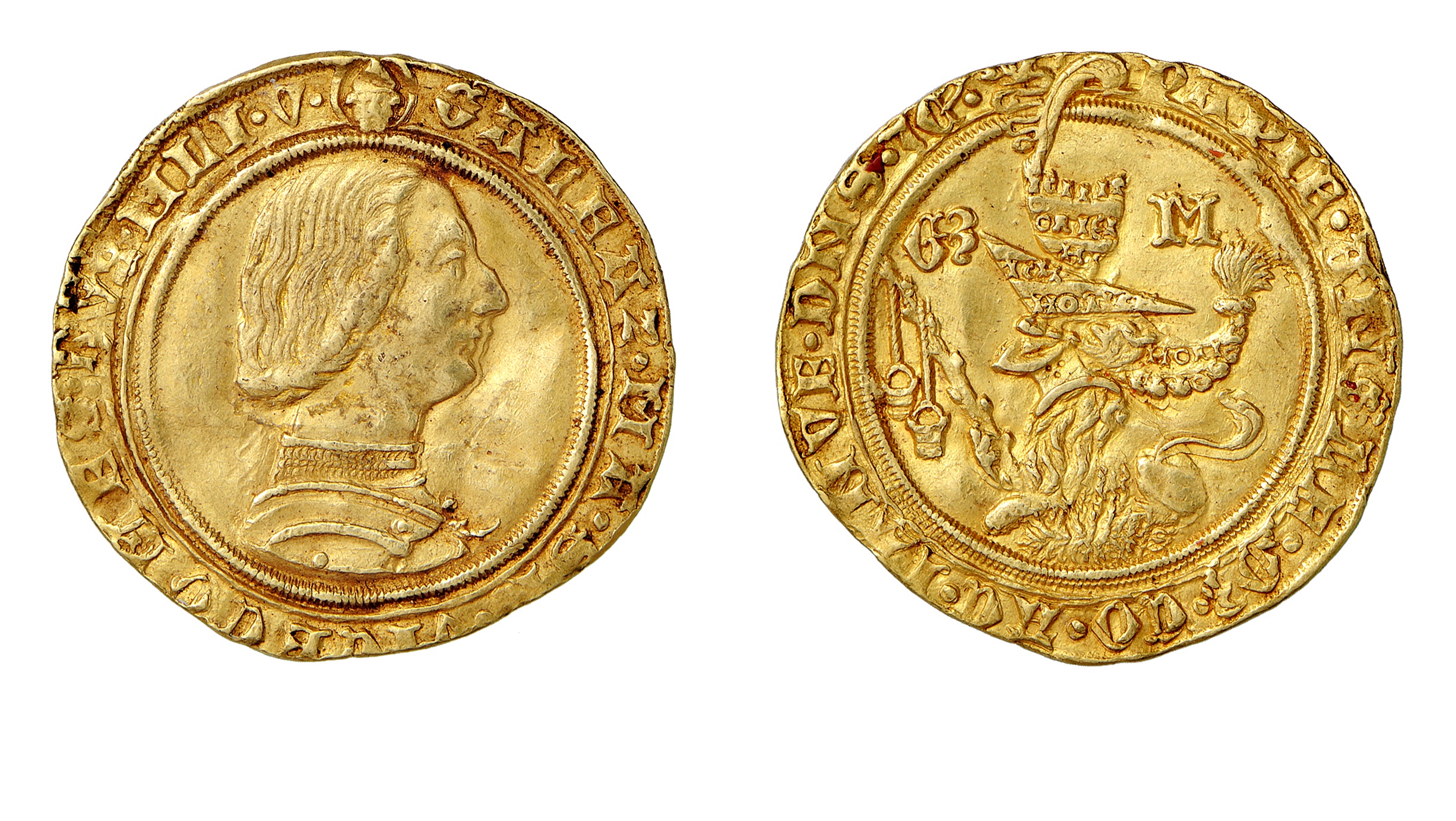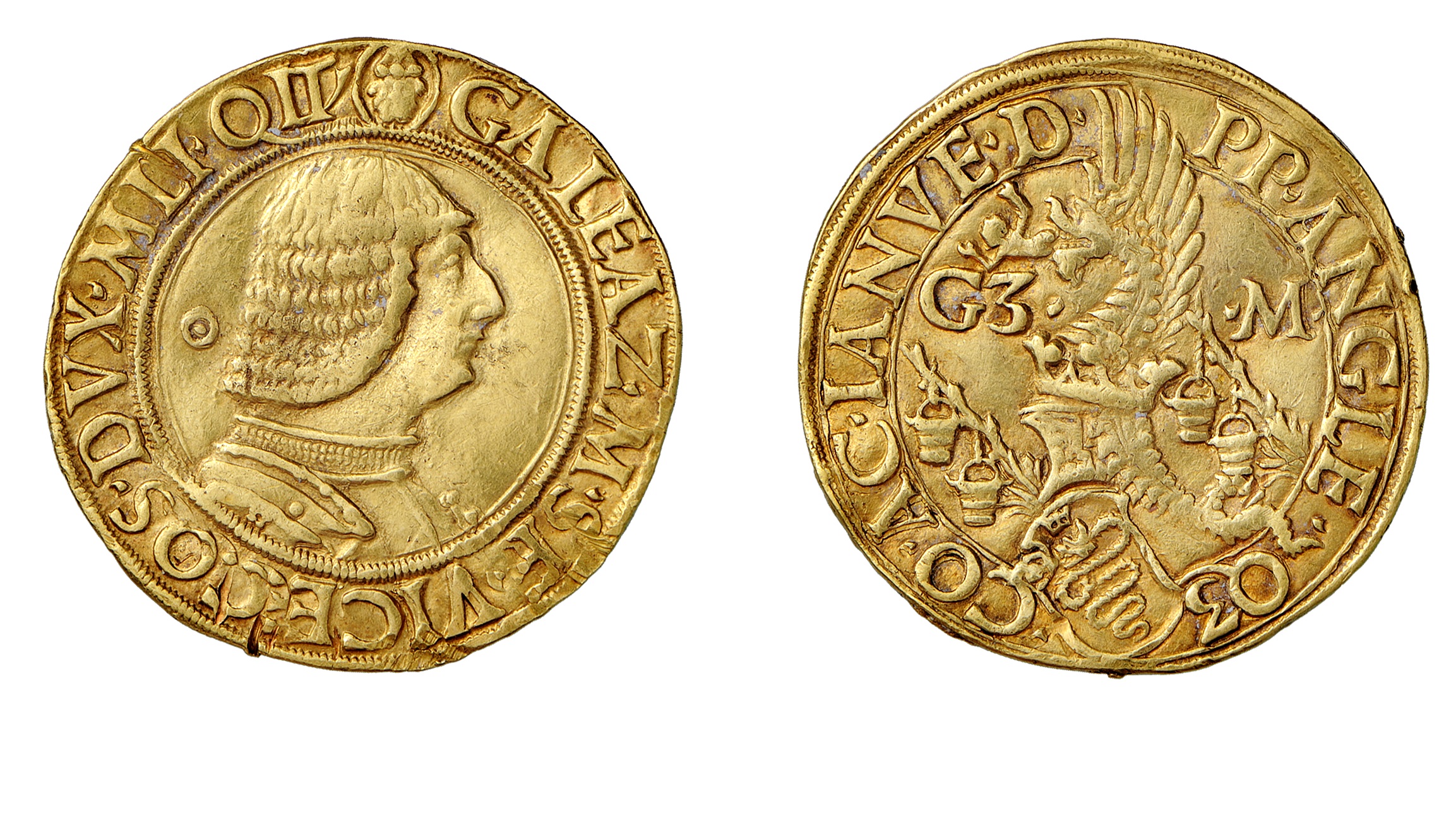 5. doppio ducato, oro; D/ busto corazzato di Galeazzo Maria R/ leone accovacciato tra le fiamme: nella zampa destra il tizzone con le secchie