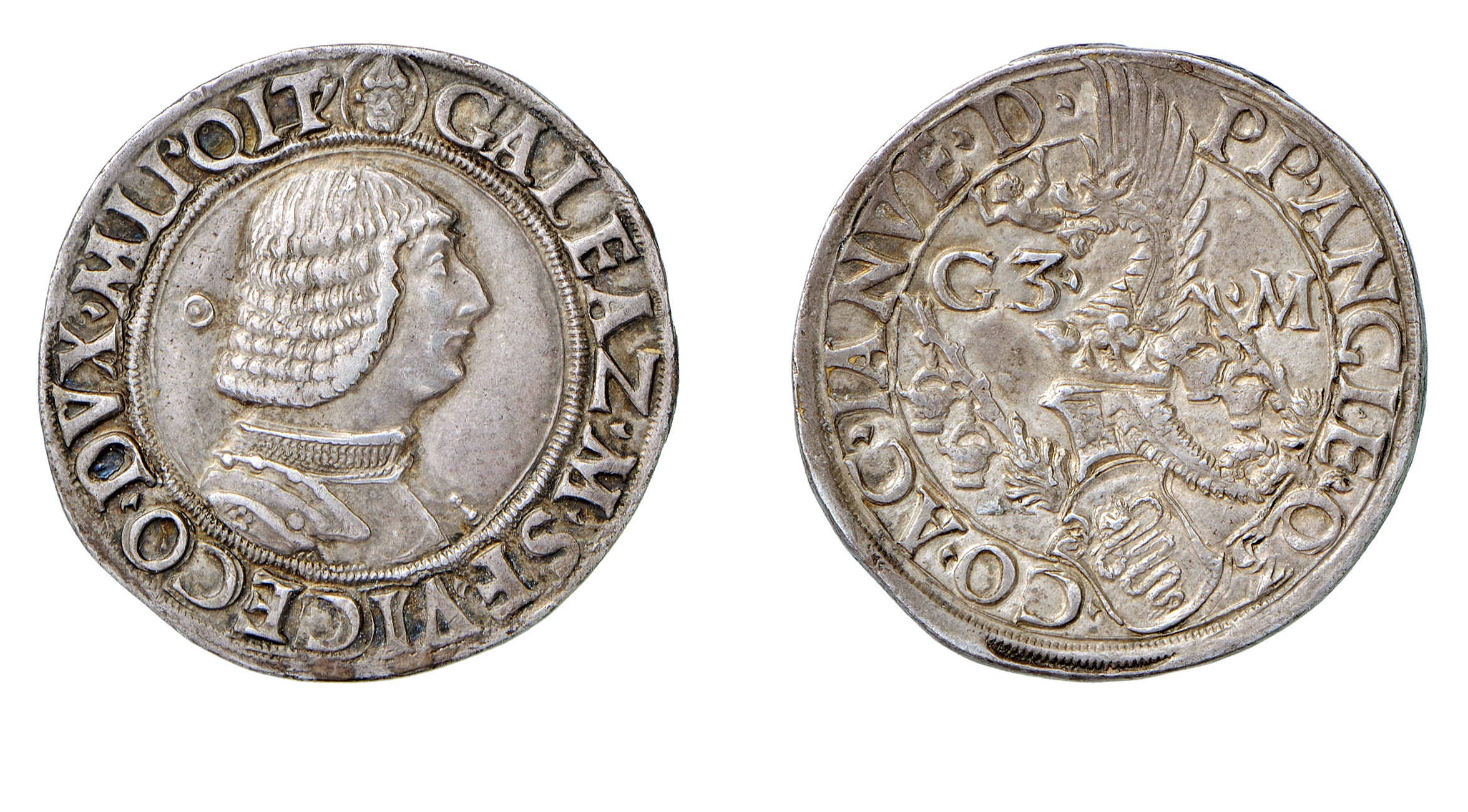 8. testone o lira da 20 soldi, argento; D/ busto corazzato di Galeazzo Maria R/ cimiero sormontato da drago, ai lati tizzoni con le secchie
