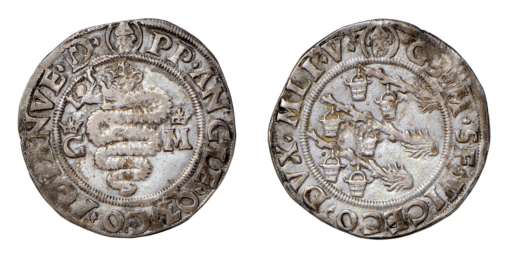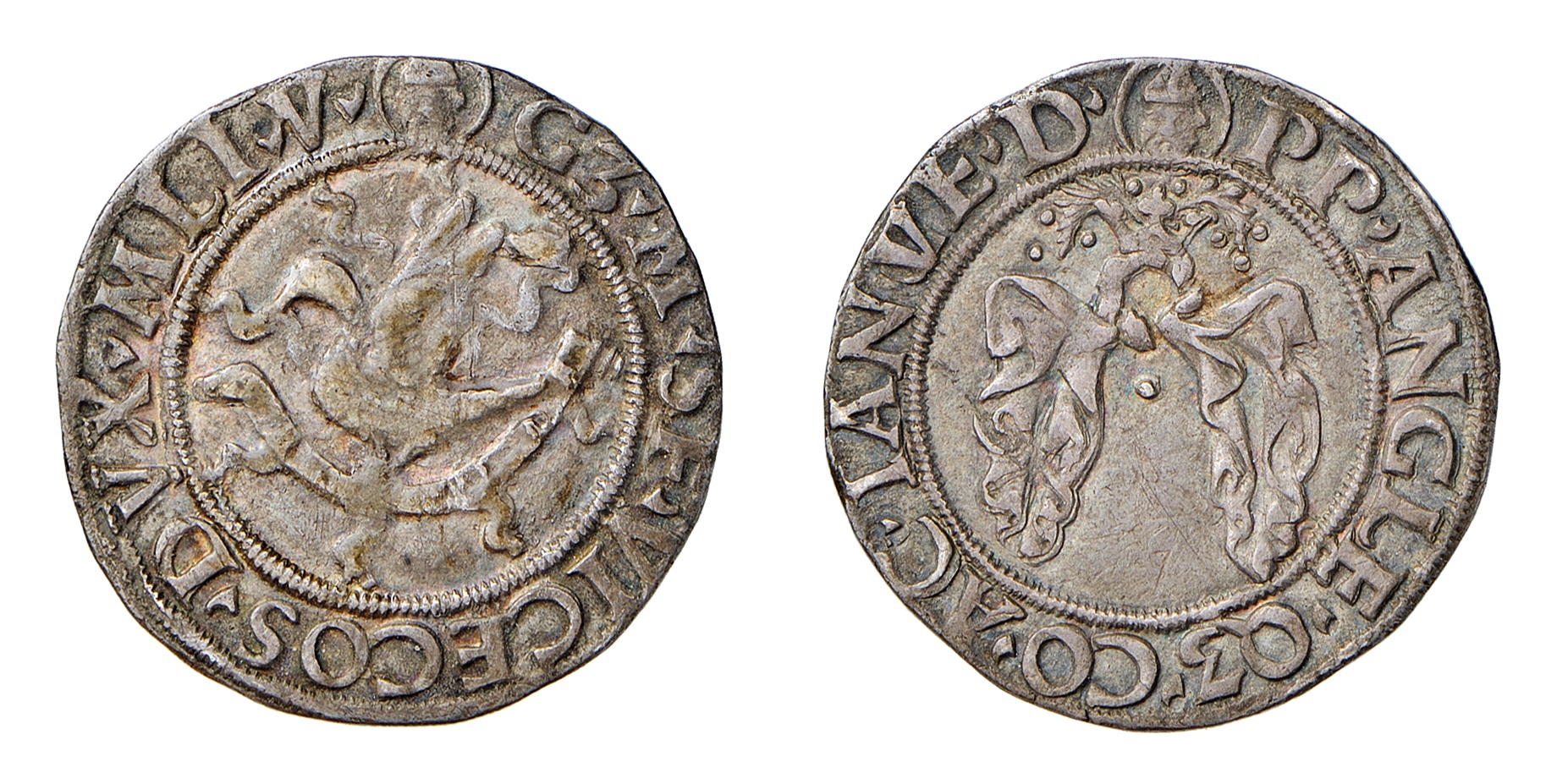 Nella consistente produzione monetale di Galeazzo Maria Sforza prevale nettamente la raffigurazione dell’impresa dei tizzoni ardenti con le secchie. Già propria di Galeazzo II Visconti, allude alla virtù di temperare l’ardore con la prudenza. Compare sul doppio ducato, accostato al leone accovacciato e accompagnato dal motto ich hof (io spero) (fig. 5) e sul rovescio dei ducati ai lati del cimiero con drago (figg. 6, 7). La medesima composizione di diritto e rovescio e la stessa iconografia, con l’impresa accostata al cimiero, è presente sul testone o lira da 20 soldi in argento, introdotto con la riforma monetaria del 1474 (fig. 8). Da segnalare anche il grosso in argento da 5 soldi (fig. 9) con biscia coronata sul dritto e soli tizzoni e secchie a tutto campo sul rovescio.
