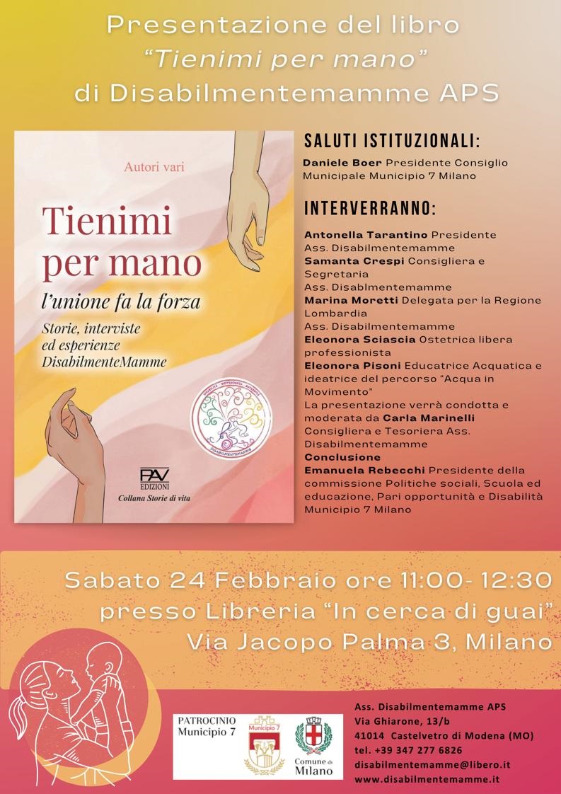 Milano, 7 febbraio 2024 - L’associazione Disabimente Mamme con il patrocinio del Municipio 7 vi invita alla presentazione del libro “Tienimi per mano” sabato 24 febbraio alle ore 11:00 presso la libreria “In cerca di guai” in via Jacopo Palma, 3 a Milano.