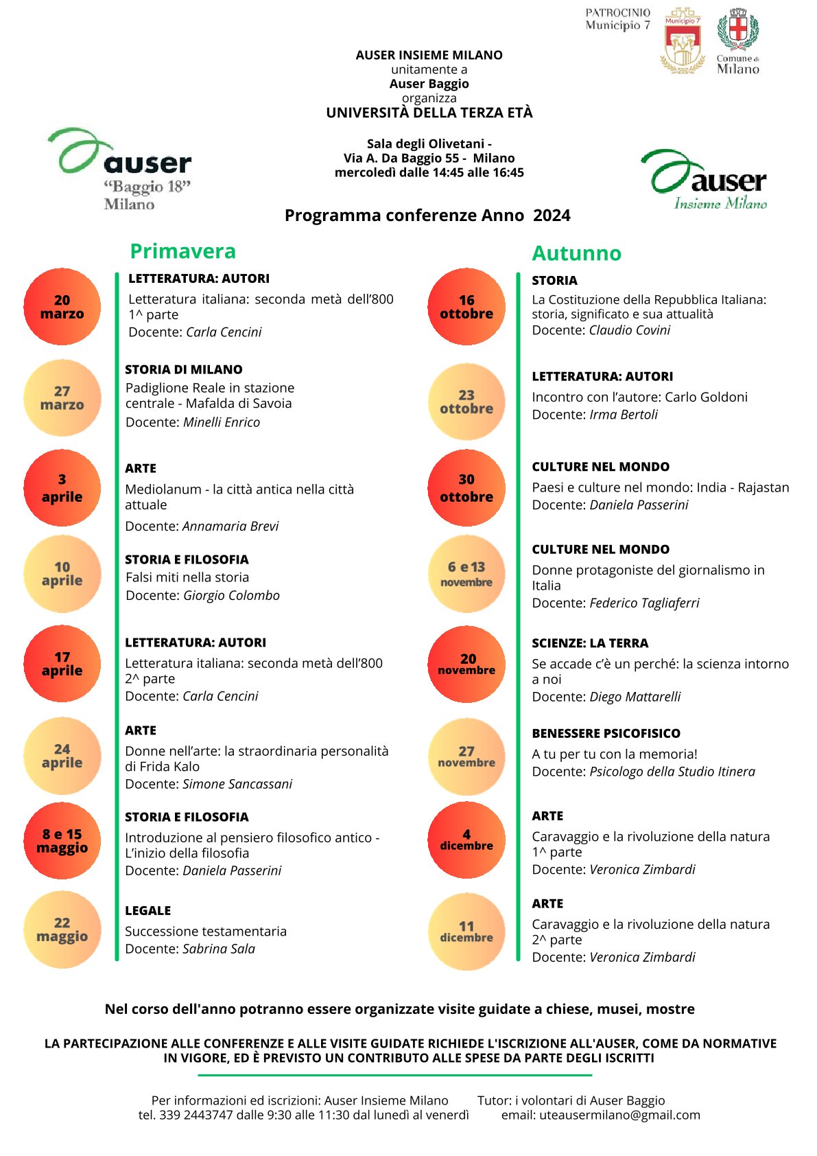 Milano, 23 ottobre 2024 - Sono ripartite le conferenze per l’Università della Terza Età organizzate da Auser Insieme Milano e Auser “Baggio 18”, con il patrocinio del Municipio 7 - Comune di Milano.